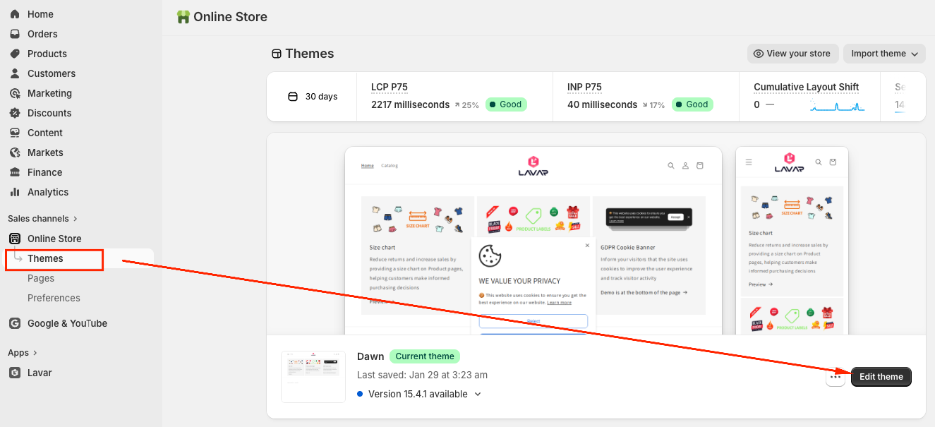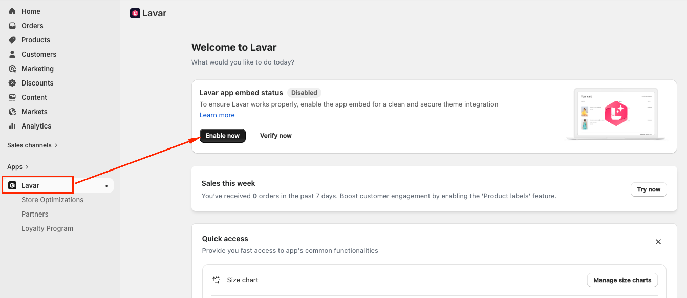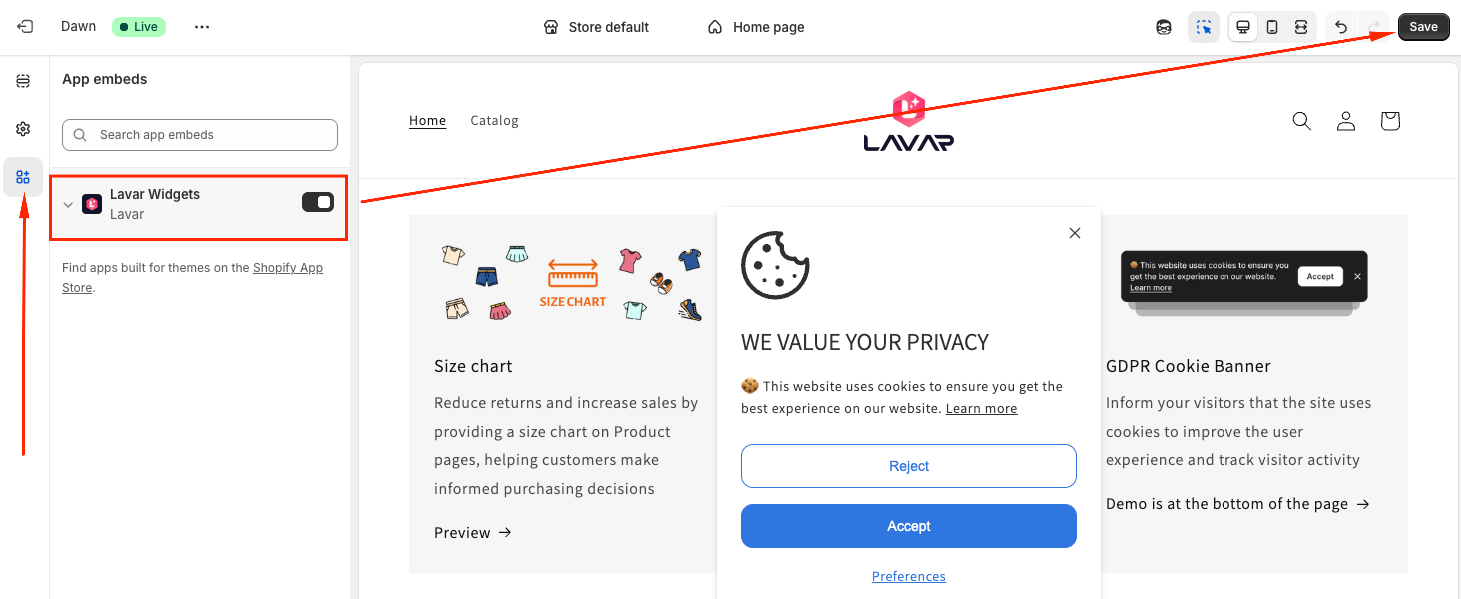 Before using Lavar features such as product badges, size charts, or the cookie consent banner, you need to enable the Lavar app embed inside your Shopify theme.