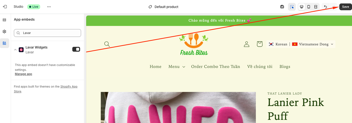 (2) Choose the "App embeds" tab -> Toggle ON the "Lavar" app embed and Save: