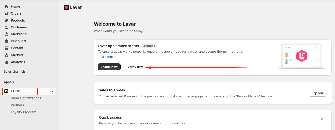 (3) Once the activation is complete, please go back to the Lavar tab, click Verify to ensure the app is working properly on your store.