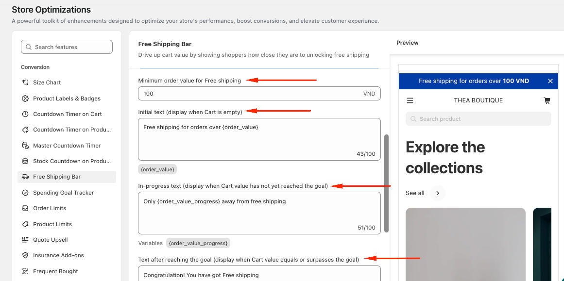 Navigate to Store Optimizations → Free Shipping Bar