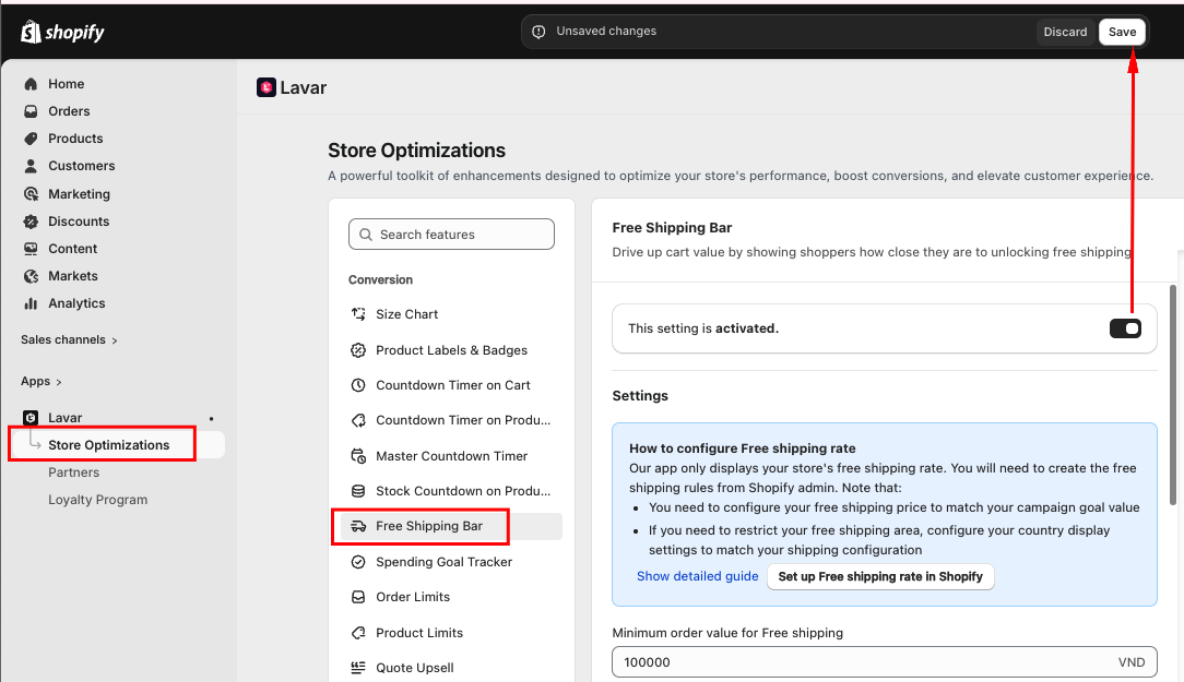 Lavar only displays your store’s existing free shipping rate. So you must first create a free shipping rule in Shopify Admin.