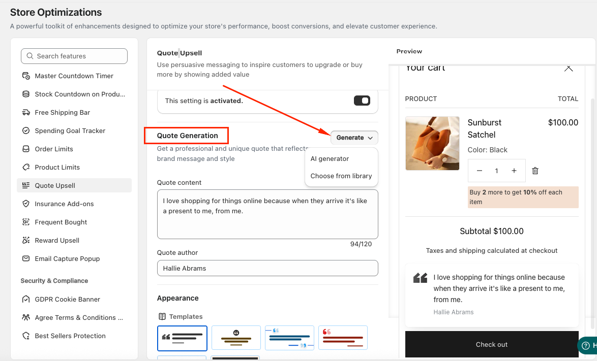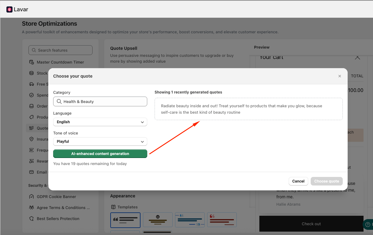 (1) AI Quote Generator: Use the built-in AI tool to generate professional quotes that match your brand. You can select the Category, Language, and Tone of voice to fit your store style.