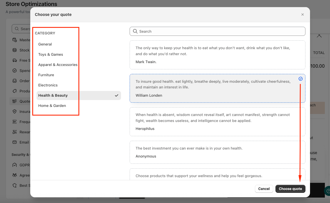 (2) Choose from library: select the suitable quote for your brand based on our suggested category:
