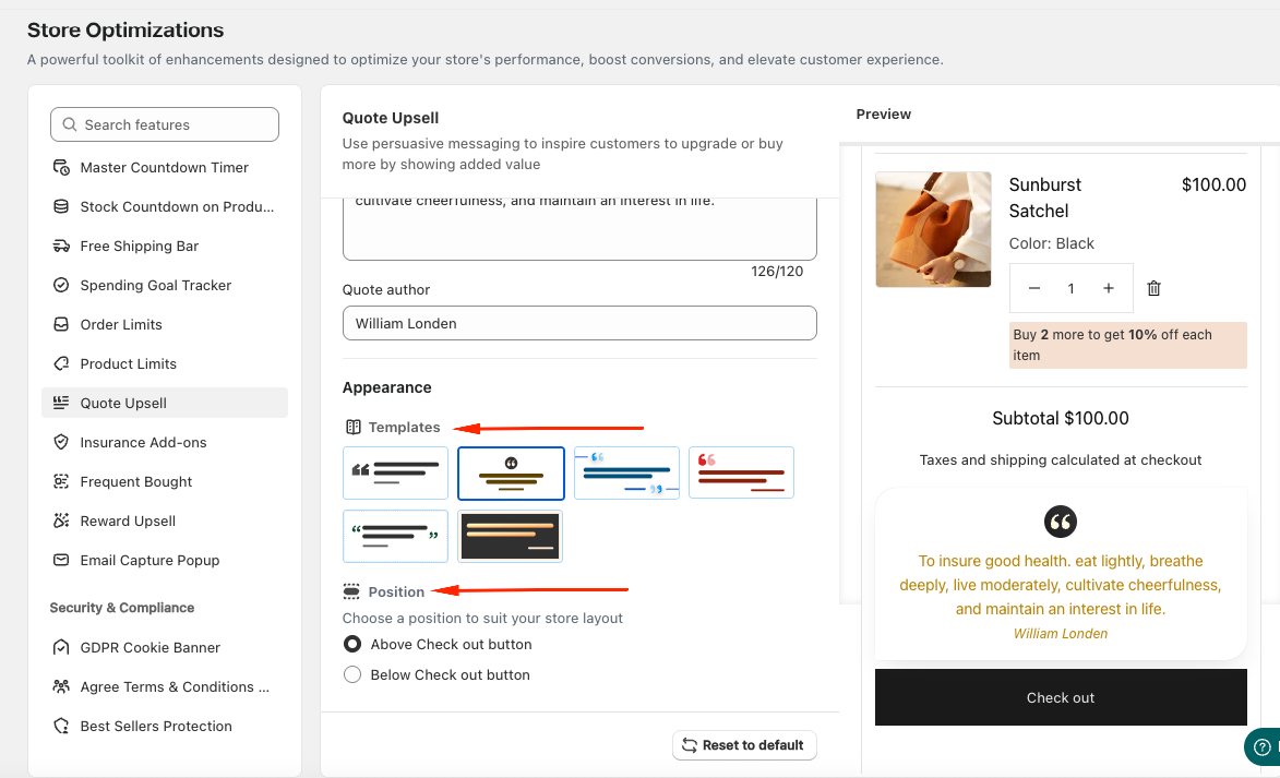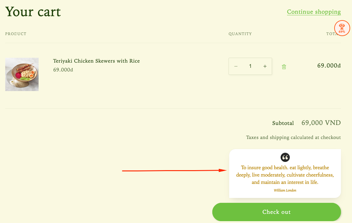 The Quote Upsell feature displays persuasive messages on the cart page to encourage customers to complete their purchase or buy more items by highlighting additional value before checkout.