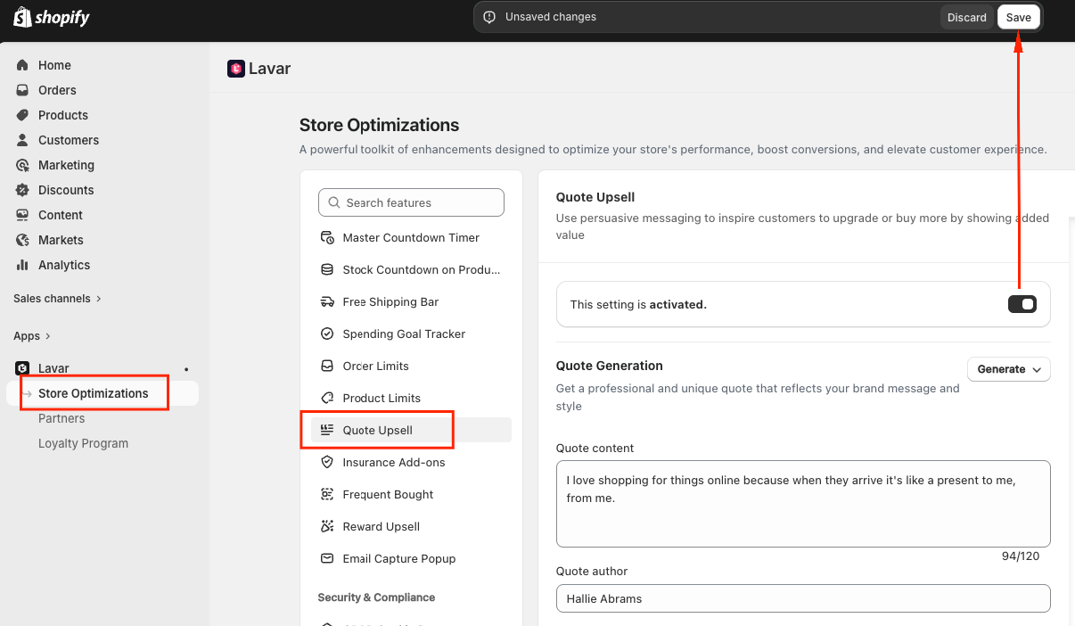 Make sure the Lavar app embed is enabled in your Theme Editor first.
