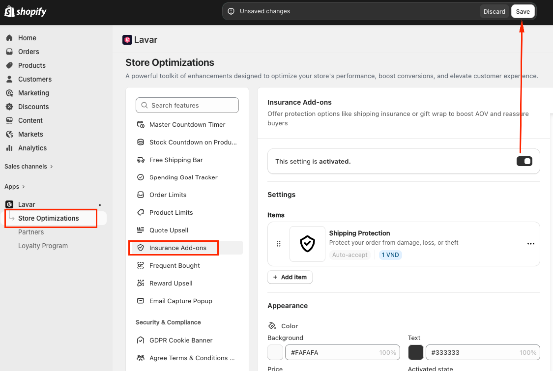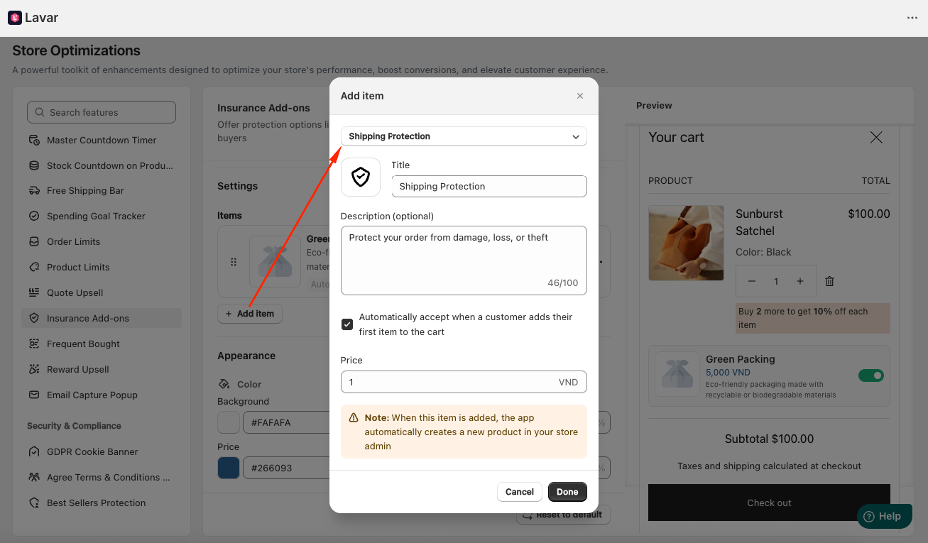 Note: When customers select an add-on item, Lavar automatically creates a corresponding product in your Shopify Admin to ensure accurate checkout processing and order tracking.