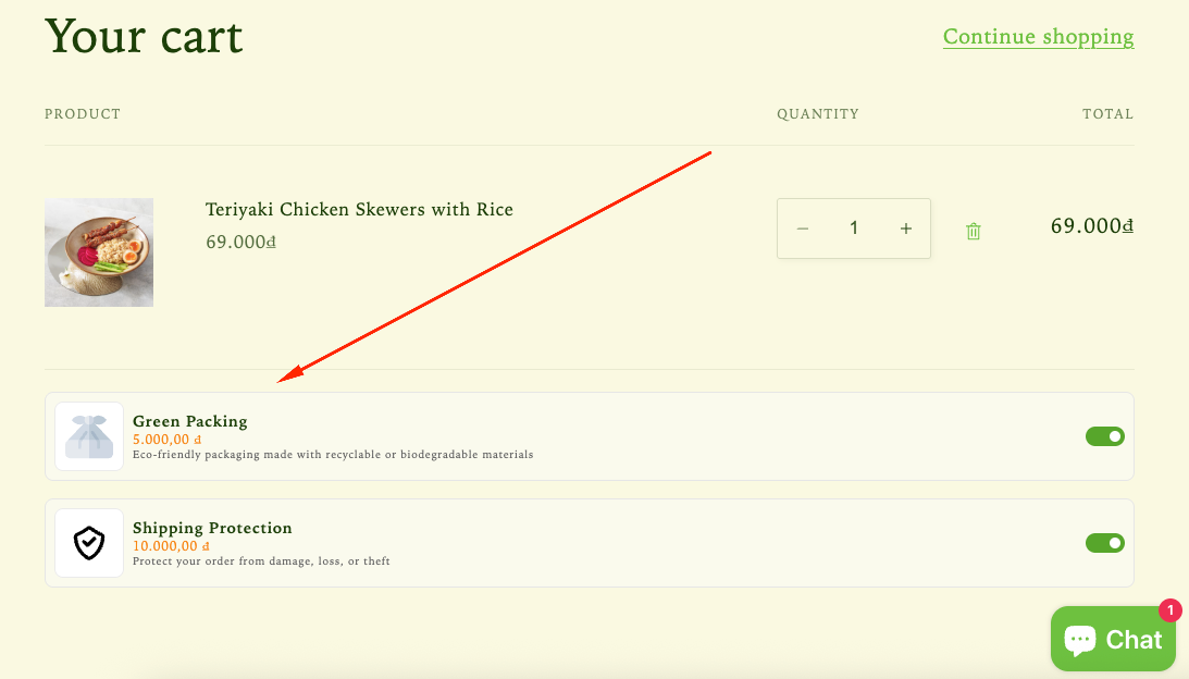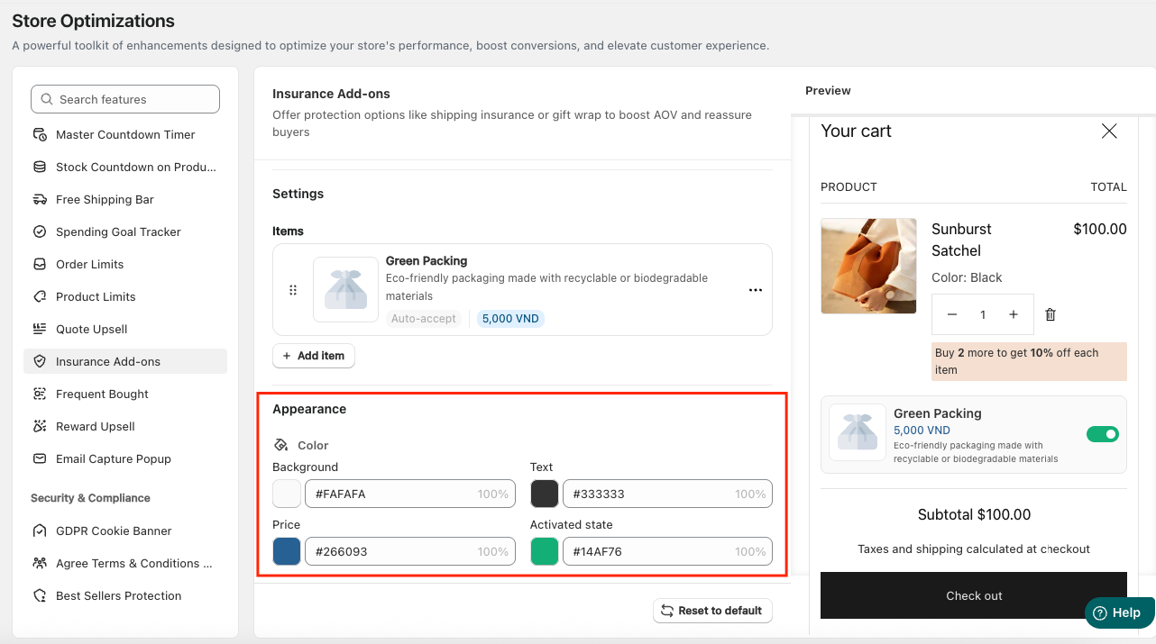 The Insurance Add-ons feature allows you to offer optional extras directly in the cart, such as shipping protection or gift wrapping. These add-ons help increase order value while giving customers additional purchase options before checkout.