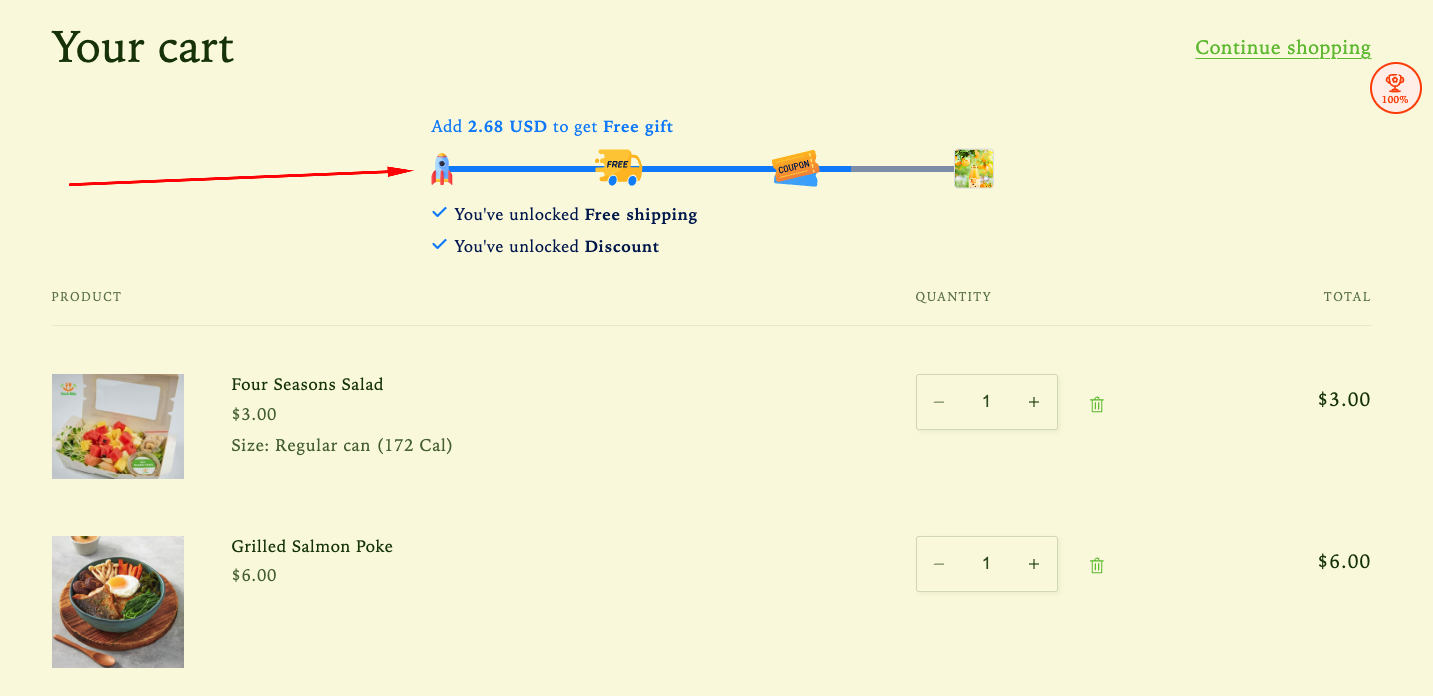 The Rewards Progress Bar helps motivate customers to add more items to their cart by visually showing how close they are to earning rewards such as discounts or free shipping. By clearly tracking progress toward a reward, this feature encourages higher spending and helps increase your store’s Average Order Value (AOV).