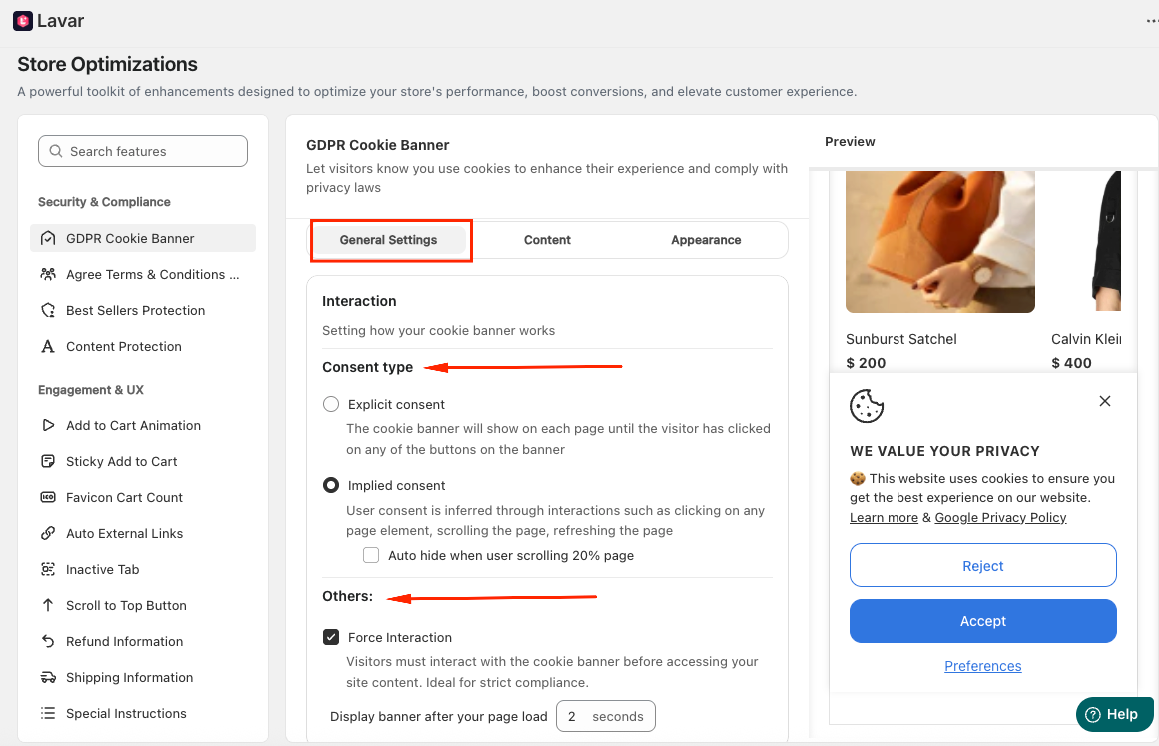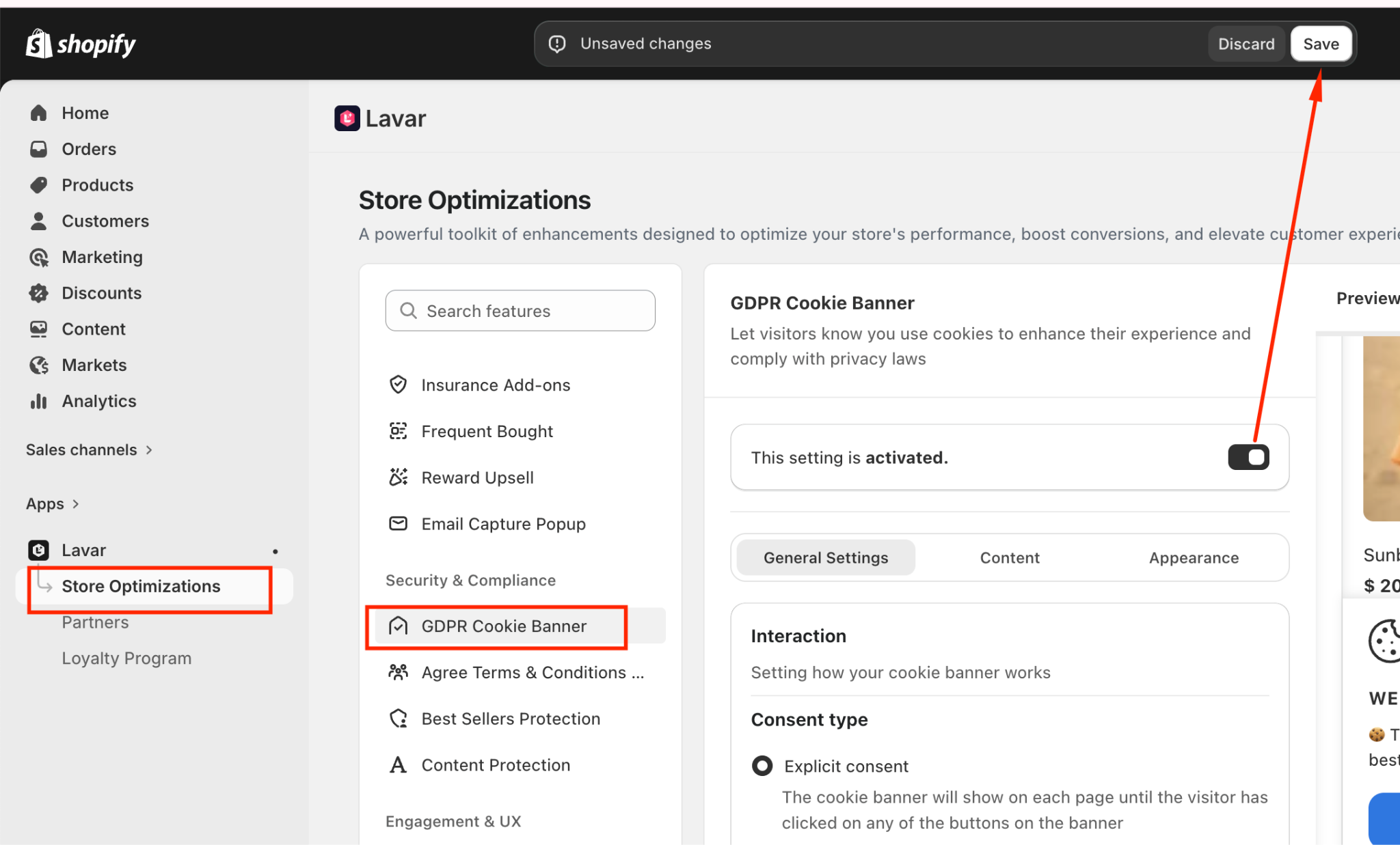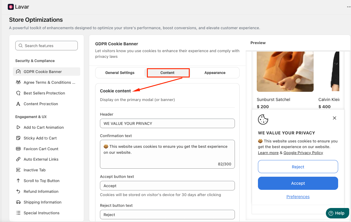 Navigate to Store Optimizations → GDPR Cookie Banner