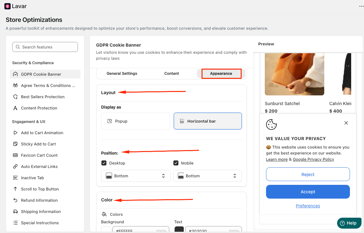 In the Appearance Settings section, you can customize how the cookie banner looks on your storefront: