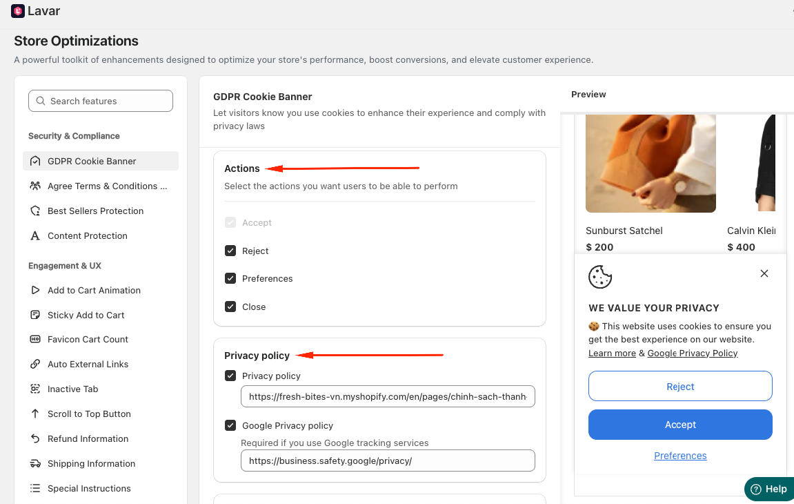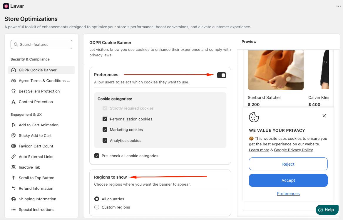 This feature allows customers to control their cookie preferences while helping your store stay compliant with international privacy laws.