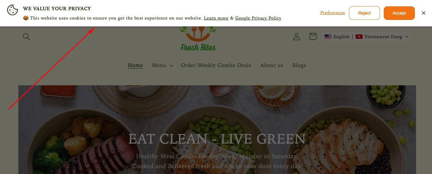 How the GDPR Cookie Banner displays on the storefront
