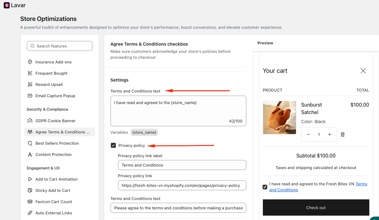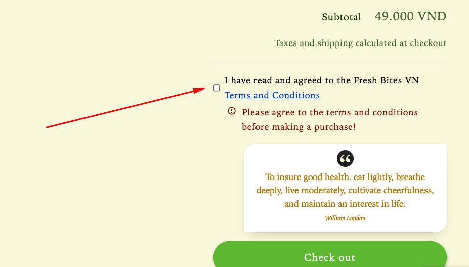 The Agree Terms & Conditions Checkbox ensures customers acknowledge your store’s policies before proceeding to checkout.
