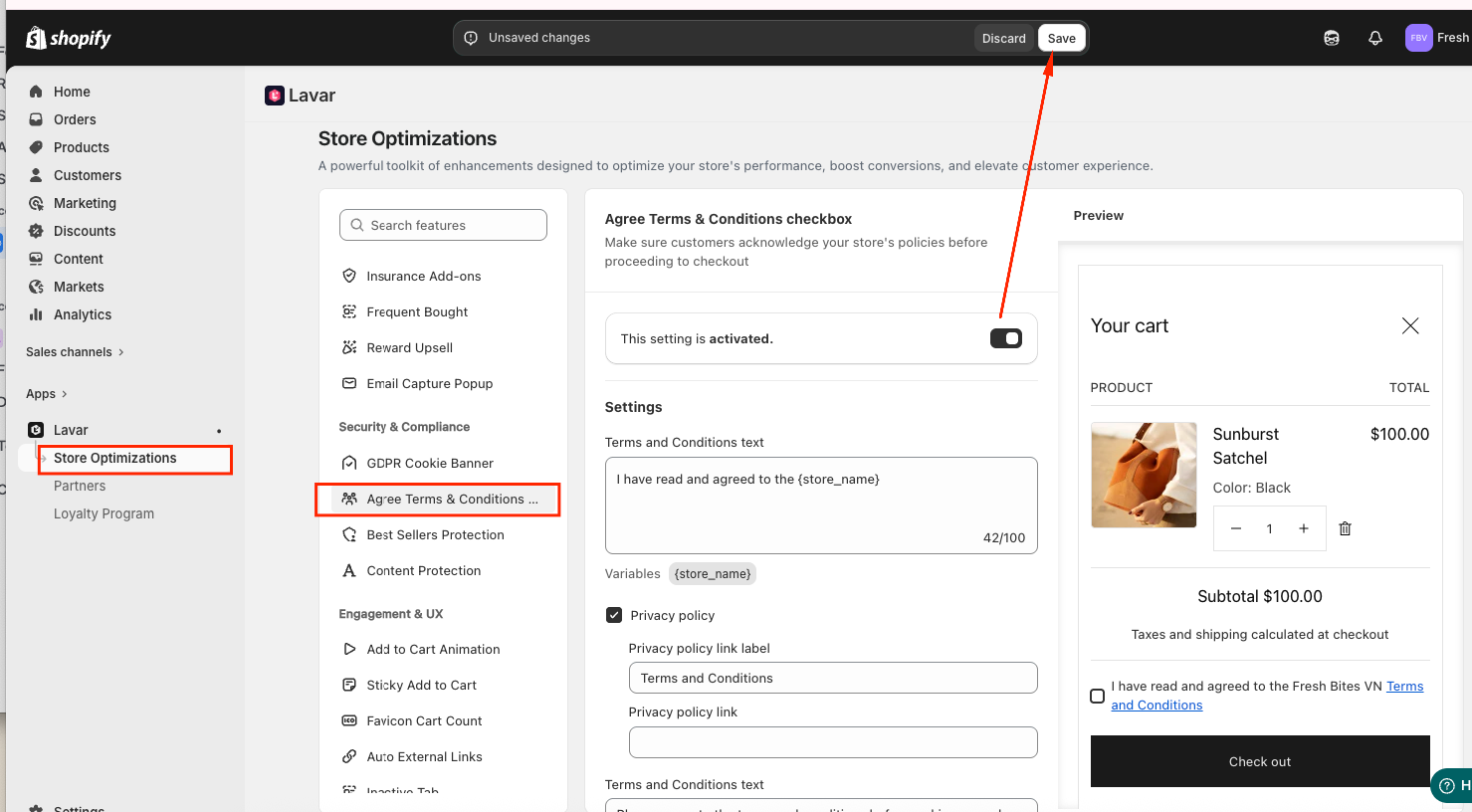 Navigate to Store Optimizations → Agree Terms & Conditions Checkbox