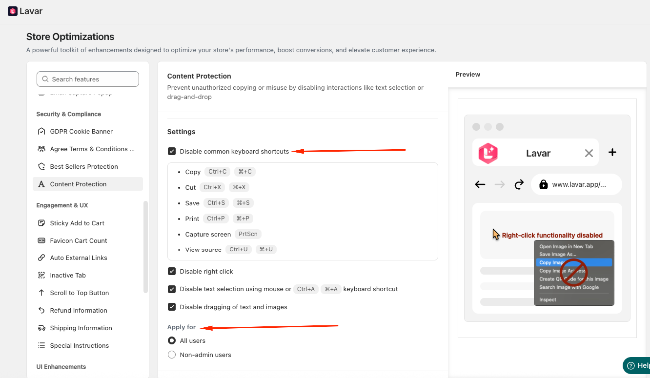 The Content Protection feature helps prevent unauthorized copying or misuse of your store content by disabling actions such as text selection, right-click, drag-and-drop, and common keyboard shortcuts.