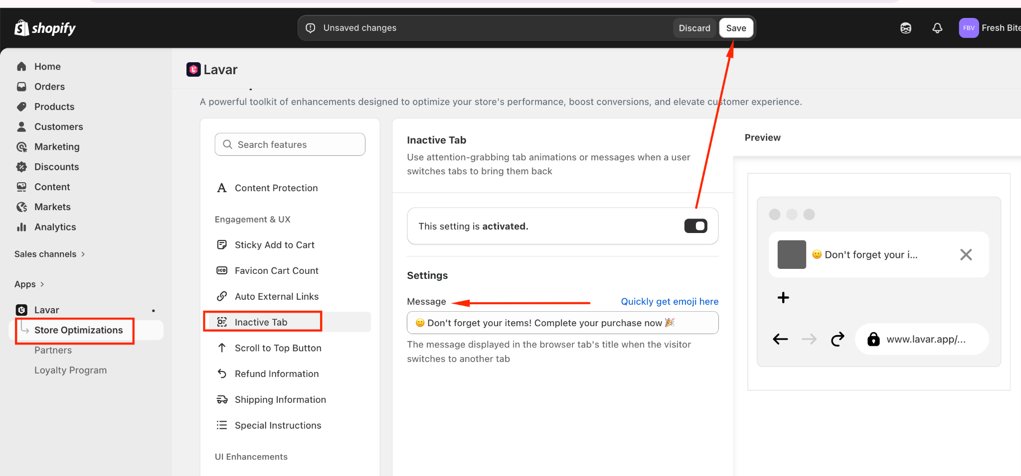 Use the Inactive Tab feature to display a custom message in the browser tab title when customers switch to another tab. This helps capture their attention and encourages them to return to your store to complete their purchase.