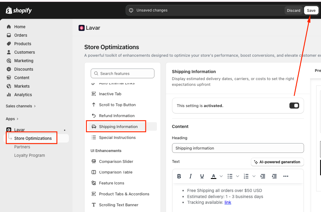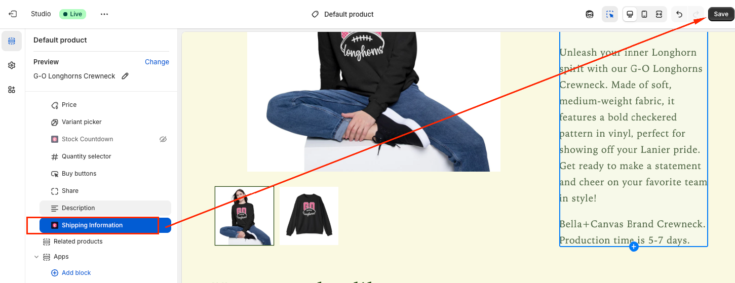 You will be directed to the Theme Editor page. Drag and place the Shipping Information block in your desired position and click Save: