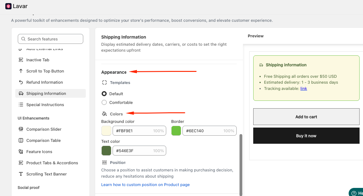In the Appearance section, you can select a template and apply colors for the Shipping Information to match store design: