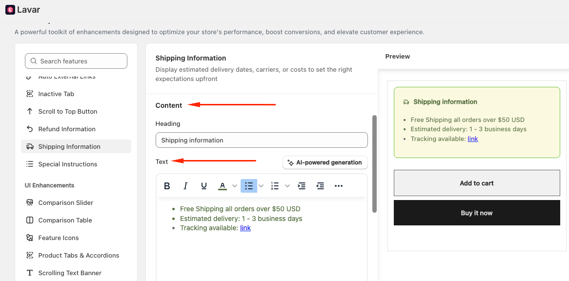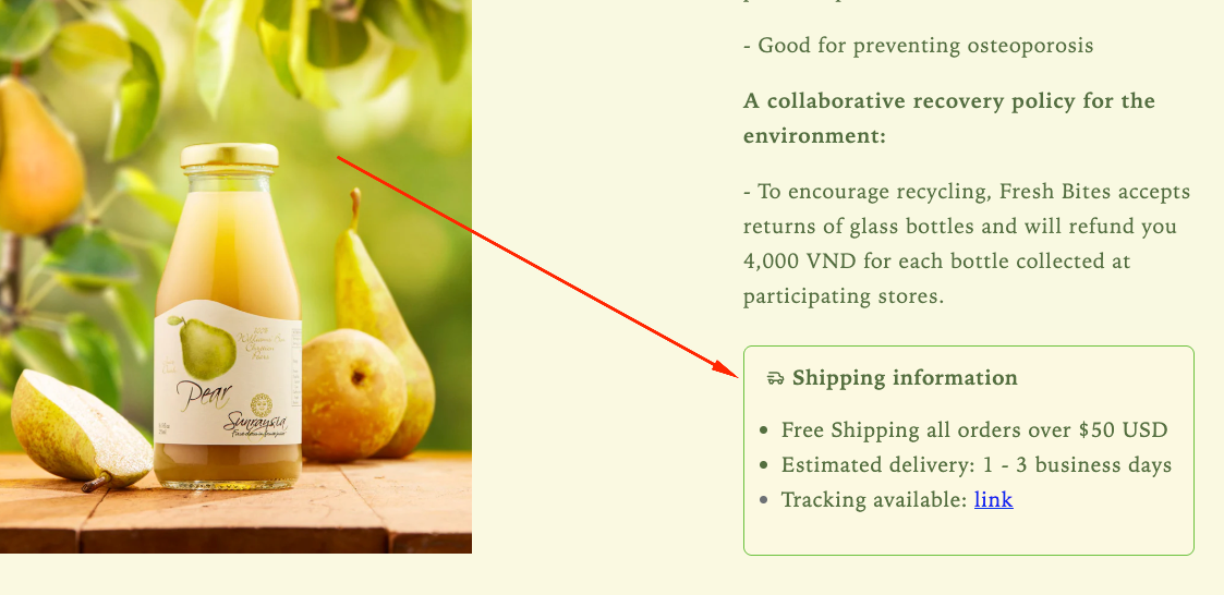 Display clear shipping details on the product page to inform customers about delivery timelines, shipping methods, or estimated costs. Providing this information upfront helps set the right expectations and improves customer confidence before purchase.