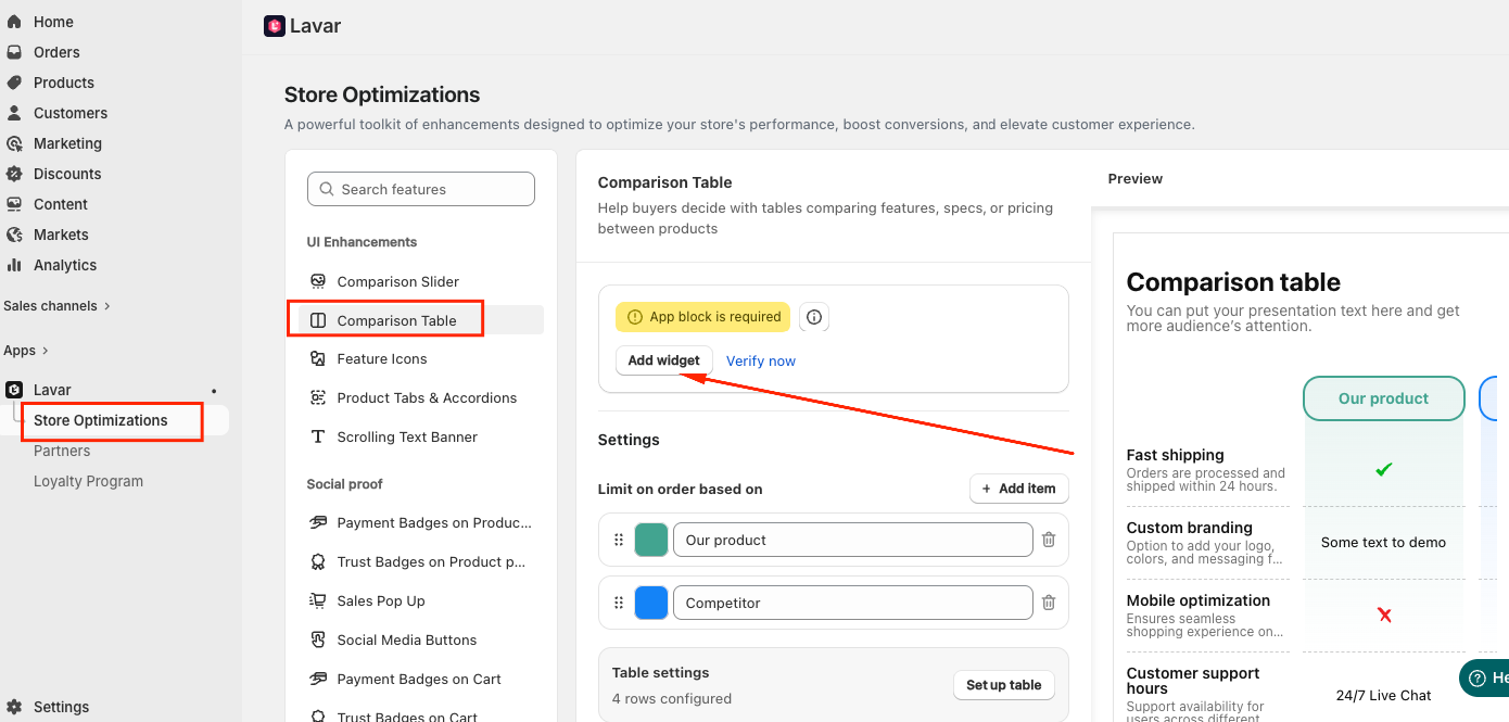 Navigate to Store Optimizations → Comparison Table