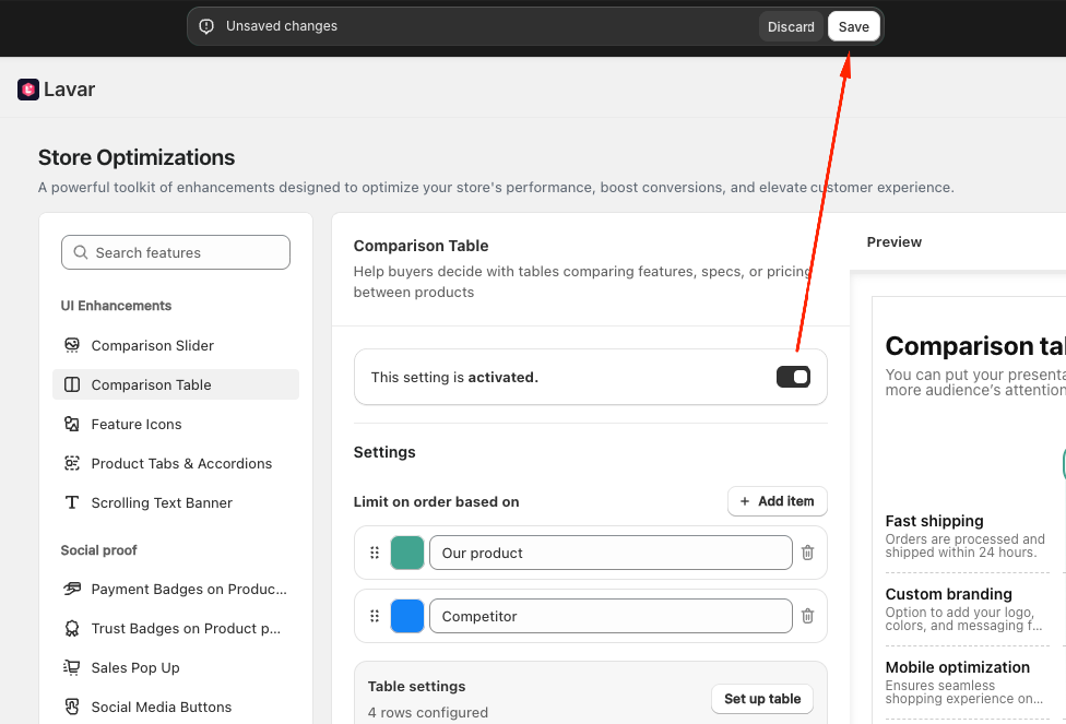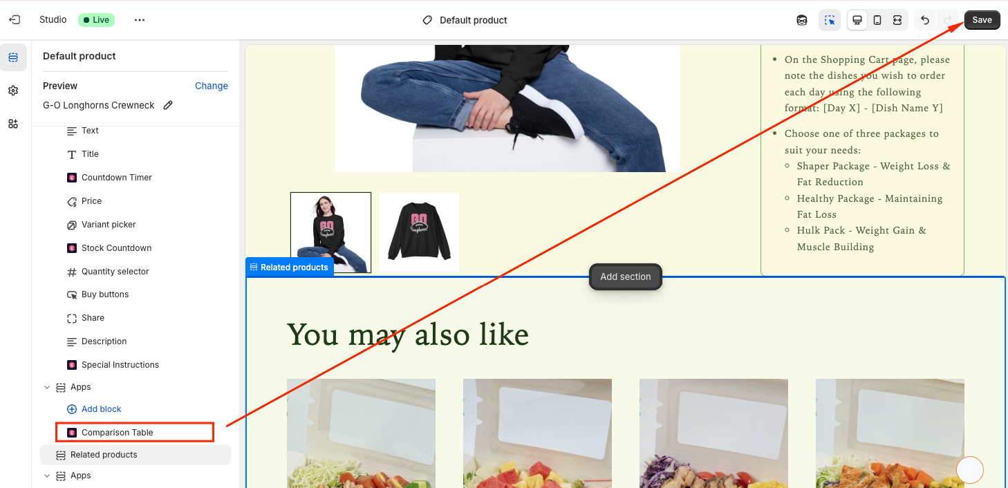 You will be directed to the Theme Editor page. Then you can move the Comparison Table to the position you want and click Save: