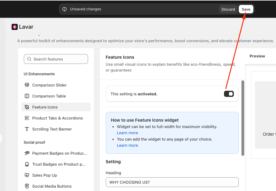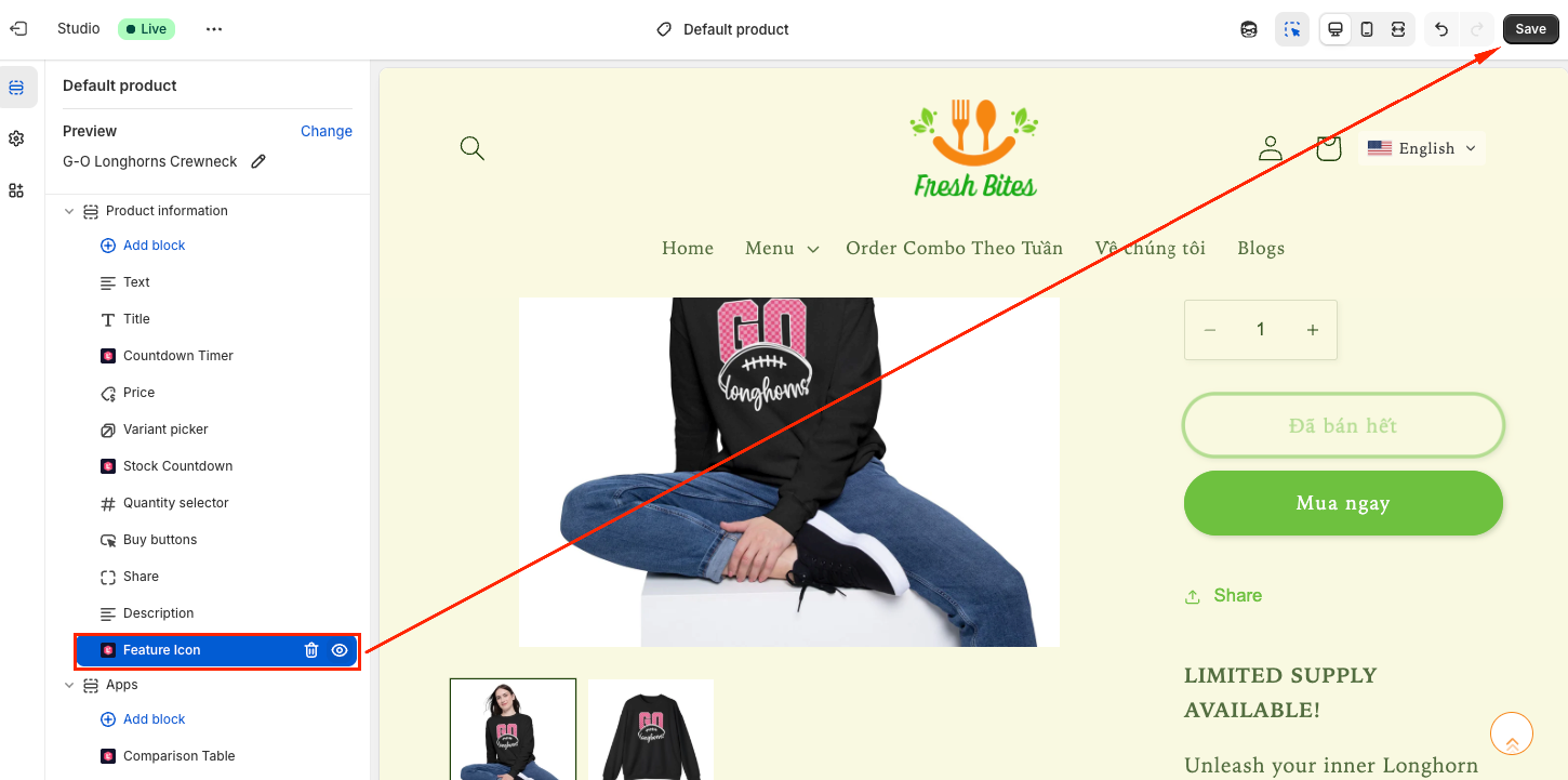 You will be directed to the Theme Editor page. Then you can move the Feature Icons to the position you want and click Save: