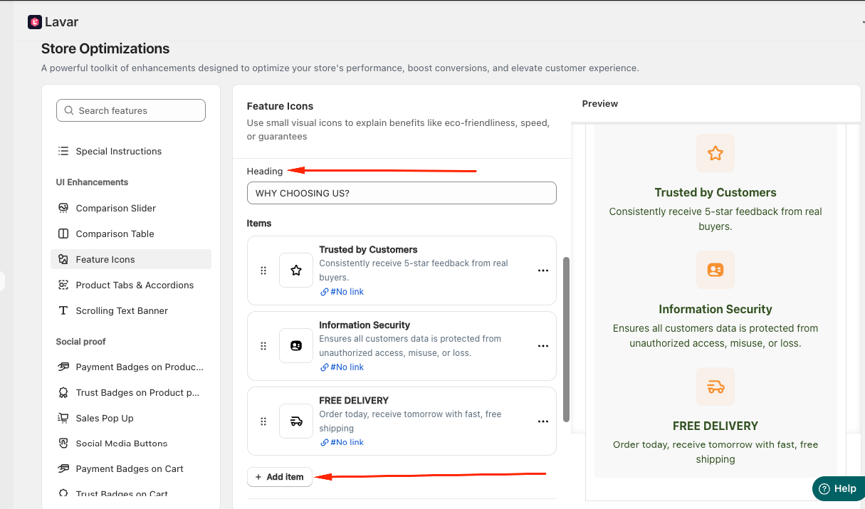 Feature Icons help customers instantly understand important advantages—such as eco-friendly materials, fast delivery, or product guarantees—making your product pages clearer, more engaging, and easier to scan.