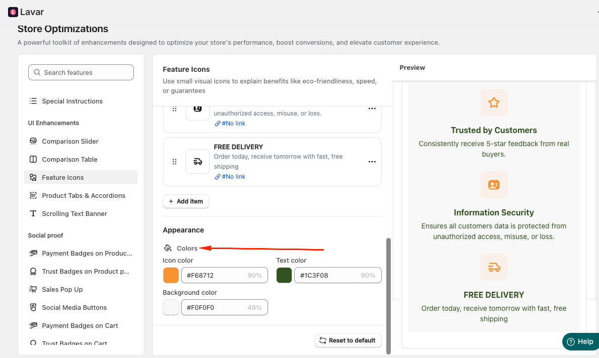 In the Appearance section, you can apply colors to match store design.