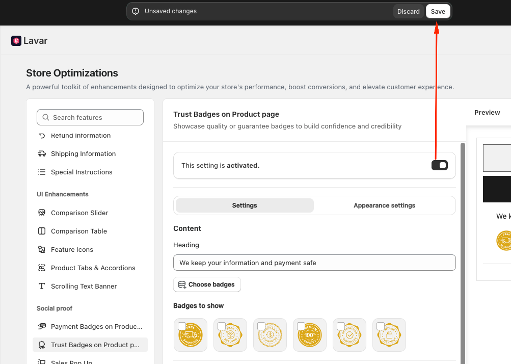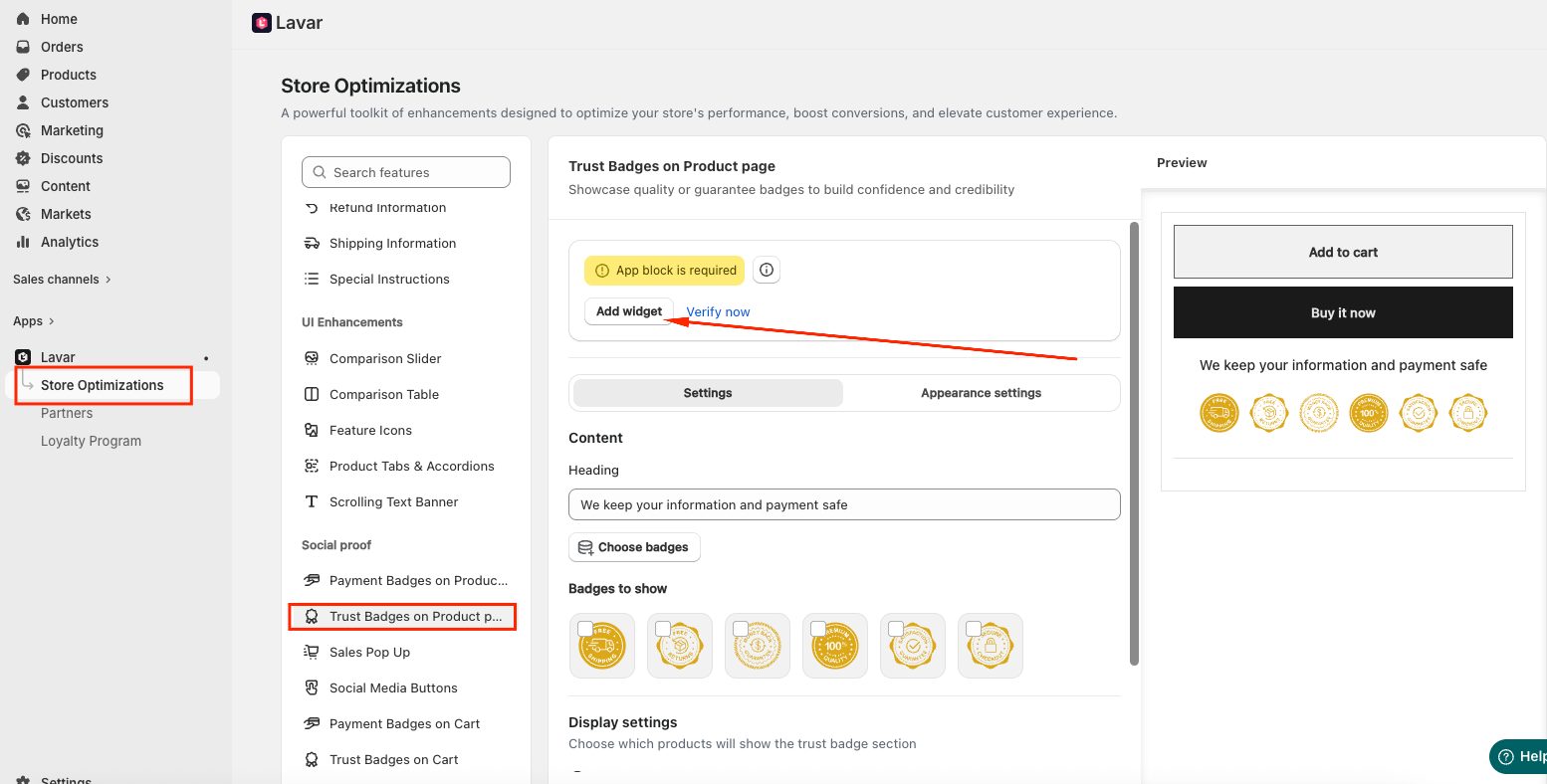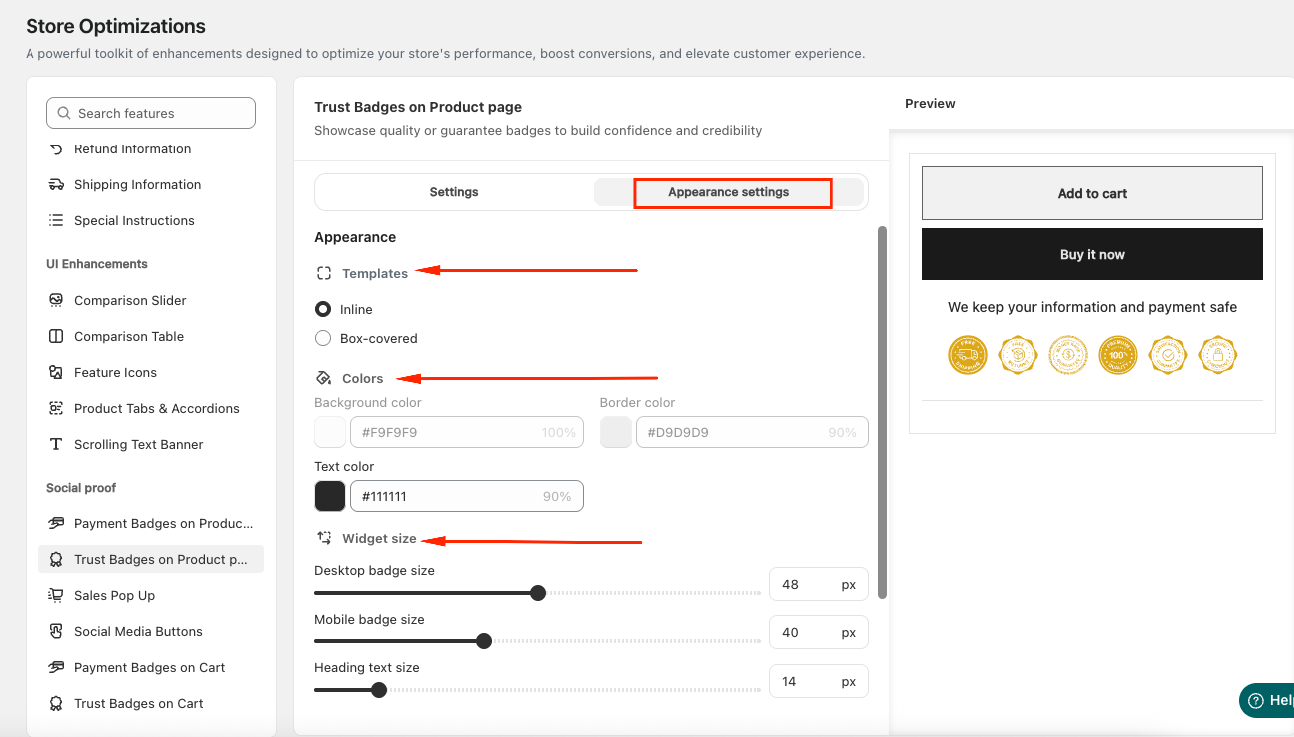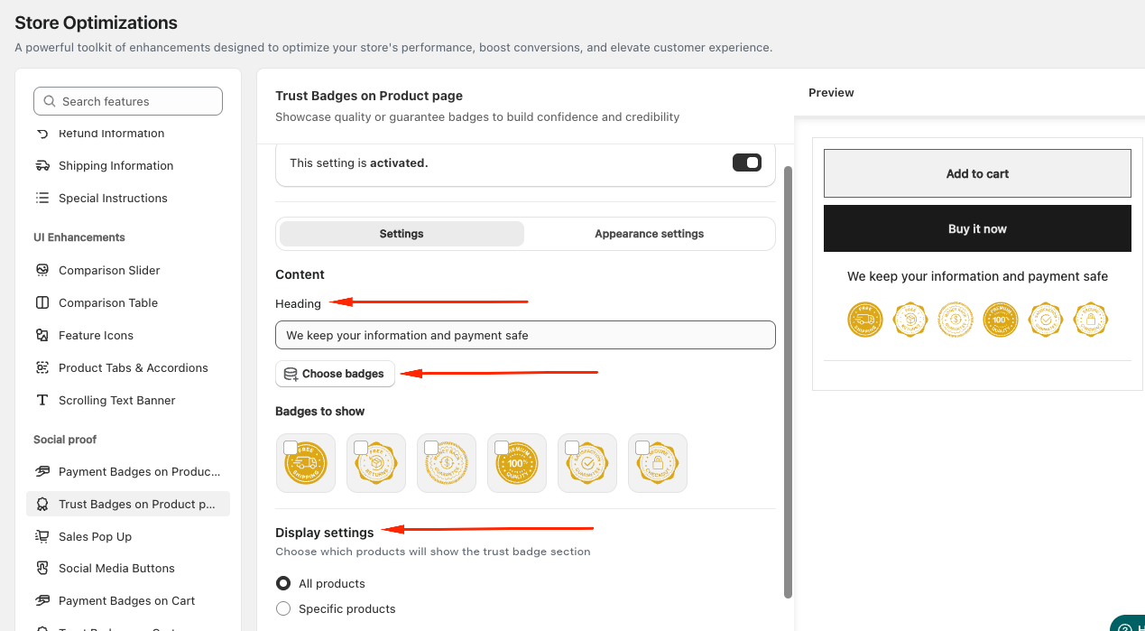 Navigate to Store Optimizations → Trust Badges on Product page