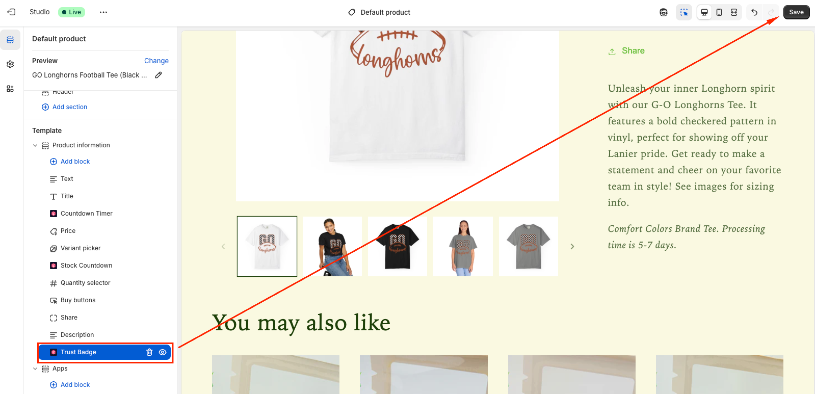 You will be directed to the Theme Editor page. Then you can move the Trust Badges block to the position you want and click Save: