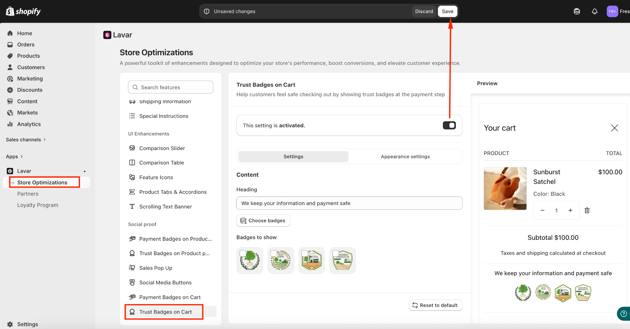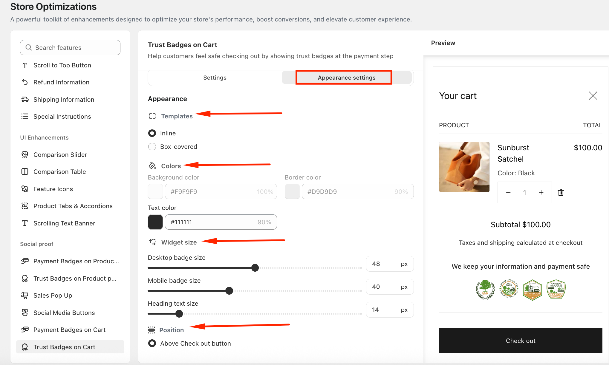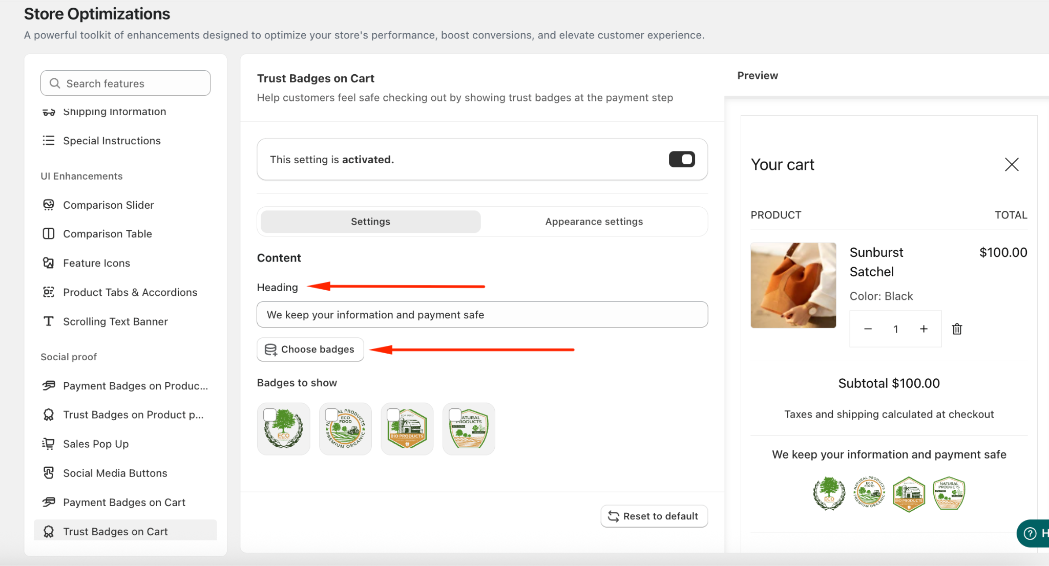 Navigate to Store Optimizations → Trust Badges on Cart