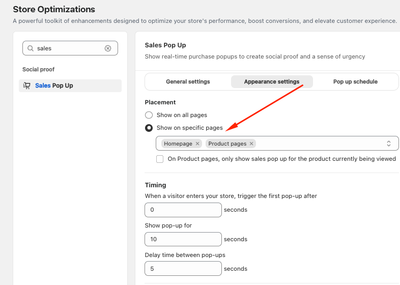 - If you selected Specific pages, the pop-up will only appear when customers visit those pages: