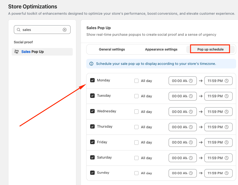 - Also, if you enabled the Schedule option, the pop-up will only appear during the selected days and time ranges.