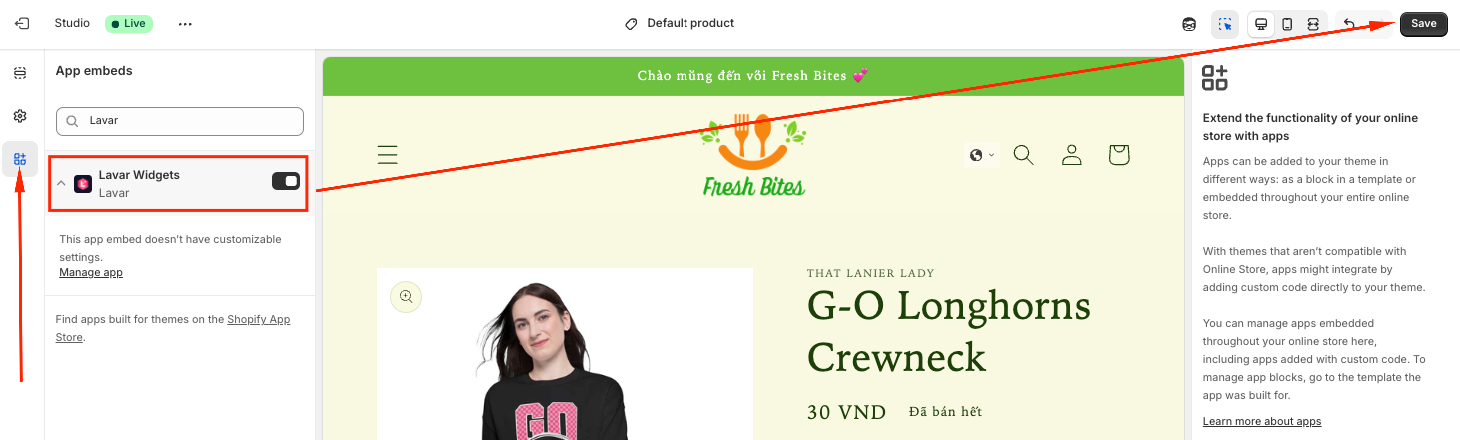 Go to Online Store → Theme Editor → App Embedded to check if the Lavar App is enabled: