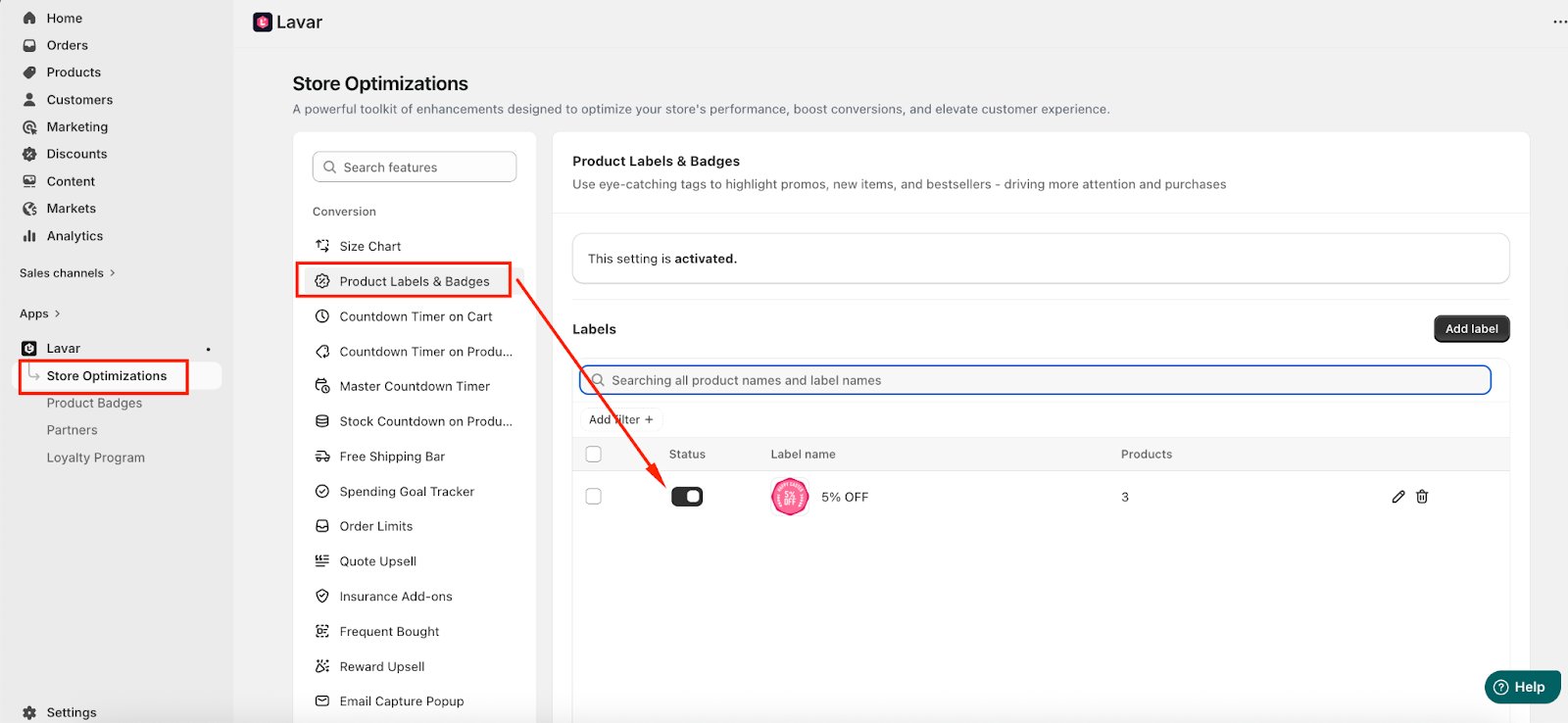 Check that the Product Badges status is activated in Lavar → Store Optimizations → Product Badges on Product page: